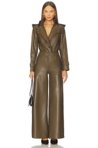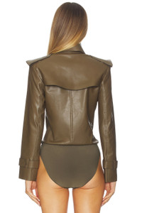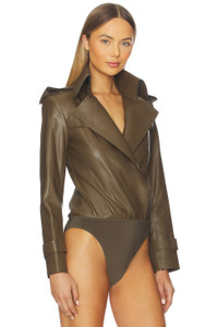 - Self 1: 100% polyurethane Self 2: 95% polyester 5% elastane - Machine wash - Pull-on styling - Padding at shoulders - Epaulettes and belted cuffs - Faux leather fabric with jersey fabric at brief - Item not sold as a set - style runs large, size down - Revolve Style No. NKAM-WS349 - Manufacturer Style No. ST325BLVG67867