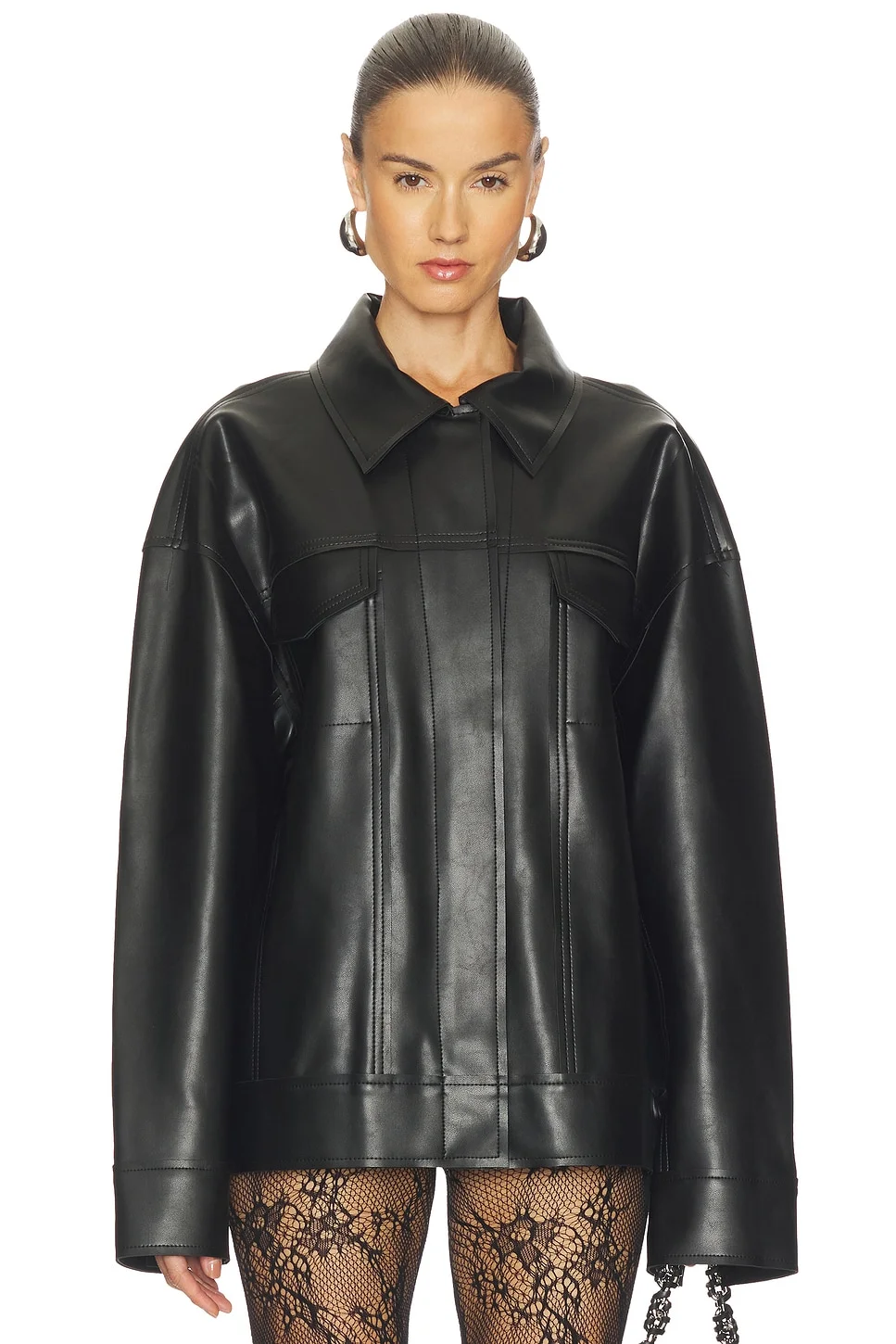 - Self 1: 100% polyurethane Self 2: 95% polyester 5% elastane Combo: 95% polyester 5% elastane - Made in China - Machine wash - Front zip and velcro closure - Midweight patent leather fabric.2 pocket styling - Revolve Style No. NKAM-WO220 - Manufacturer Style No. ST4254LV015001