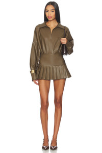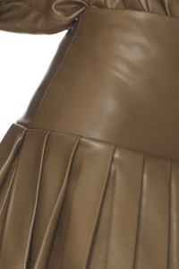 - Self 1: 100% polyurethane Self 2: 90% polyester, 10% spandex - Machine wash - Partially lined - Pull-on styling - Pleated faux leather - style runs large, size down - Skirt measures approx 12.5" in length - Revolve Style No. NKAM-WQ90 - Manufacturer Style No. ST325SLVF56867