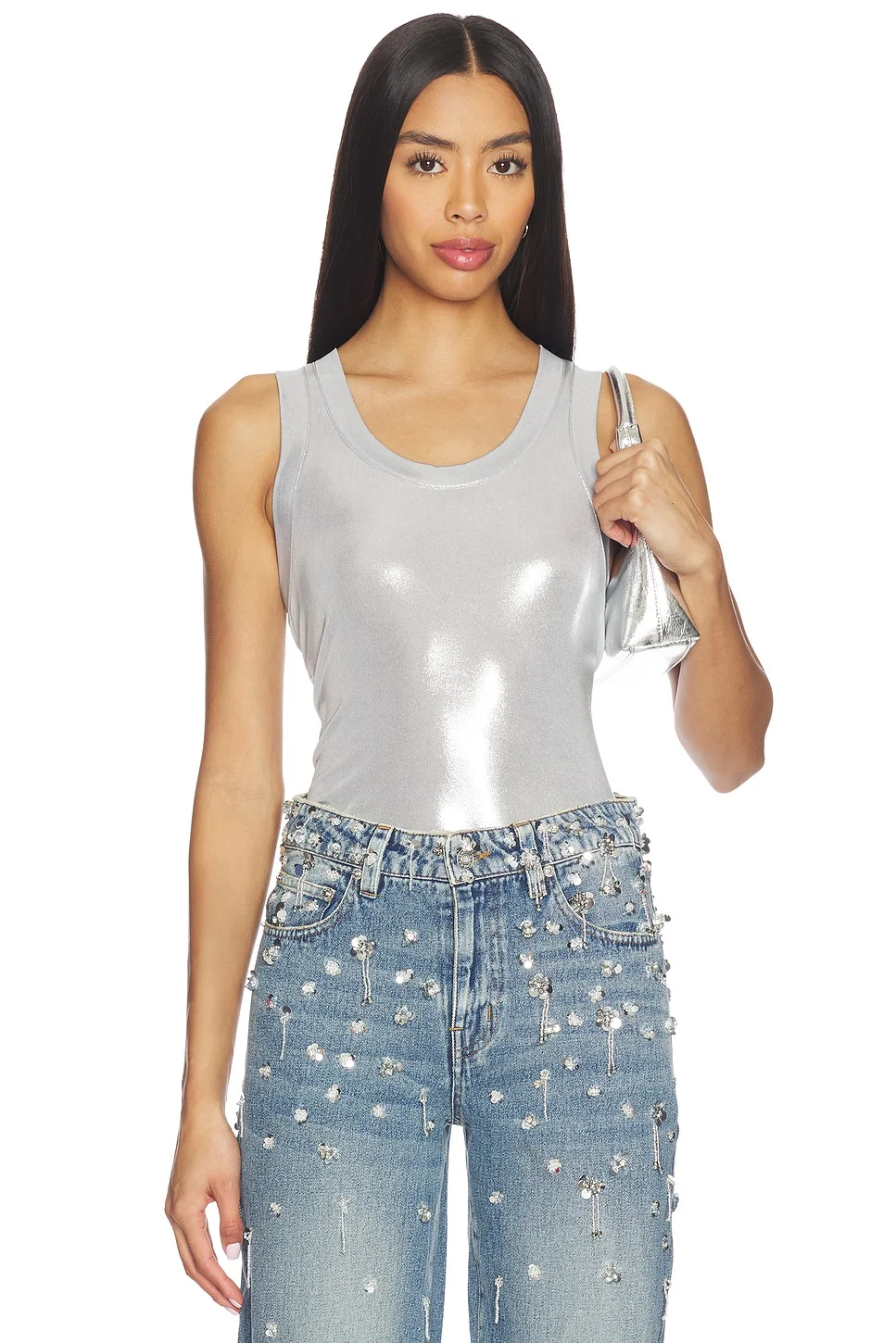 - 95% polyester 5% elastane - Made in China - Hand wash cold - Pull-on styling - Lightweight jersey fabric with metallic threading - Garment is made with a semi-sheer fabric, undergarments can show through - style runs large, size down - Revolve Style No. NKAM-WS373 - Manufacturer Style No. ST1266LM219058