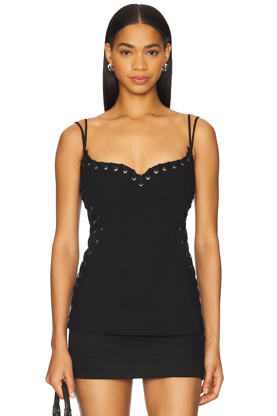 - 100% recycled polyester - Dry clean only - Concealed back zipper with hook and eye closure - Lace-up detail with grommet accents - Midweight crepe fabric - Revolve Style No. PGEO-WS33 - Manufacturer Style No. EYEHRTT001-BLK