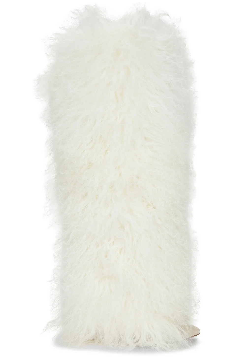 - Leather and Dyed fur upper - Fur origin: China - Pull-on styling - Pointed toe - Stiletto heel - Cuchioned leather footbed and lining - Approx 105mm/ 4.1 inch heel Approx 406mm/ 16 inch shaft Opening measures approx 17.27" in circumference - Revolve Style No. PRTX-WZ91 - Manufacturer Style No. PX1072