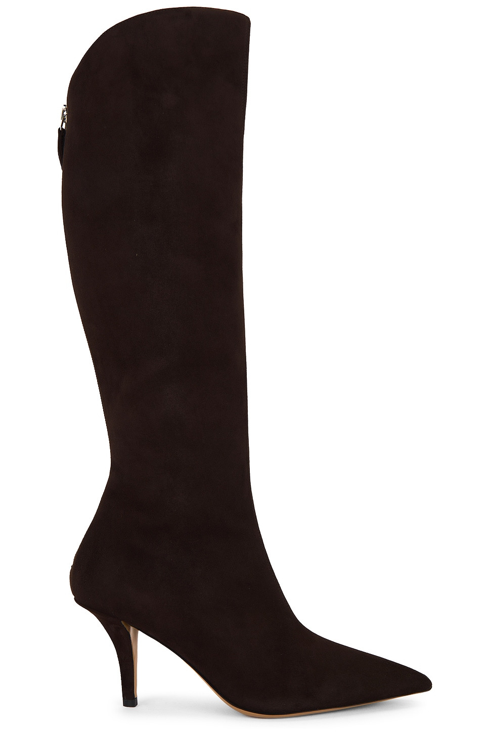 - Suede upper with leather sole - Back zipper closure - Leather footbed and lining - Pointed toe - Approx 75mm/ 3 inch heel Approx 356mm/ 14 inch shaft Opening measures approx 12.56" in circumference - Revolve Style No. PRTX-WZ87 - Manufacturer Style No. PX1419