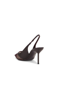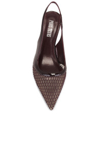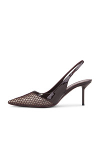 - Patent leather and mesh upper with leather sole - Sling-back styling - Cushioned leather footbed - Pointed toe - Stiletto heel - Approx 70mm/ 2.75 inch heel - Revolve Style No. PRTX-WZ65 - Manufacturer Style No. PX1622