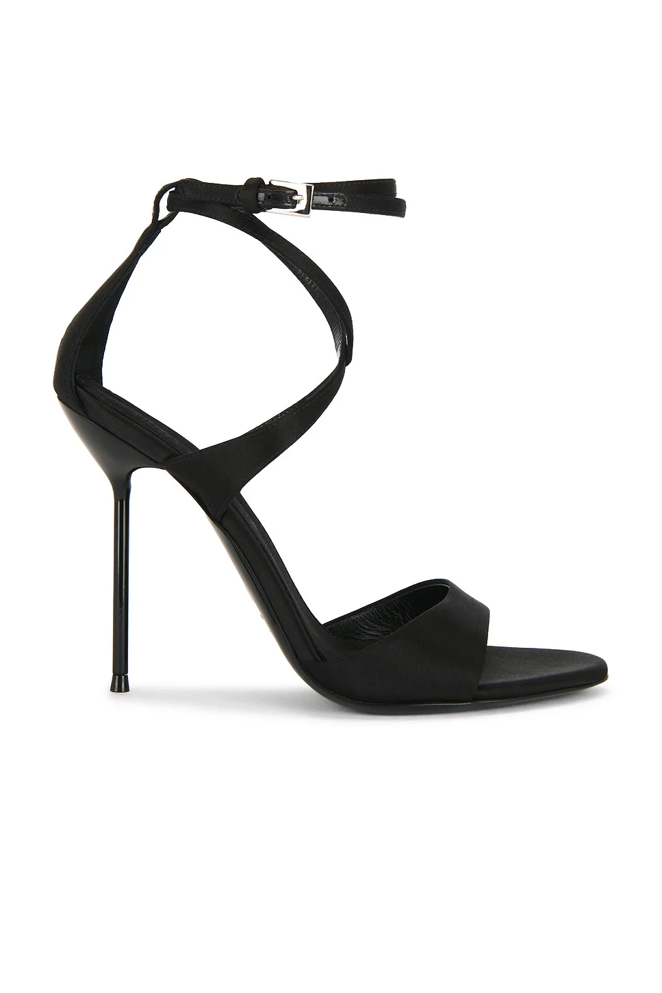 - Satin upper with leather sole - Ankle strap with buckle closure - Satin lining and insole - Almond toe - Stiletto heel - Open-toe - Strappy design - Approx 105mm/ 4.1 inch heel - Revolve Style No. PRTX-WZ111 - Manufacturer Style No. PX1793
