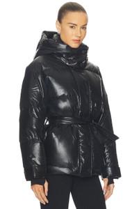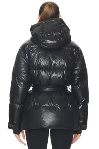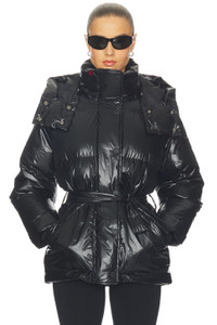 - Self: 71% polyamide 29% polyurethane Lining: 100% polyester Fill: 80% duck down 29% feather - Made in Vietnam - Machine wash cold - Front zip and snap button closure - Midweight ripstop fabric - Detachable hood - Front and inner zip pockets - Detachable waist tie - Revolve Style No. PMOM-WO71 - Manufacturer Style No. W3001188