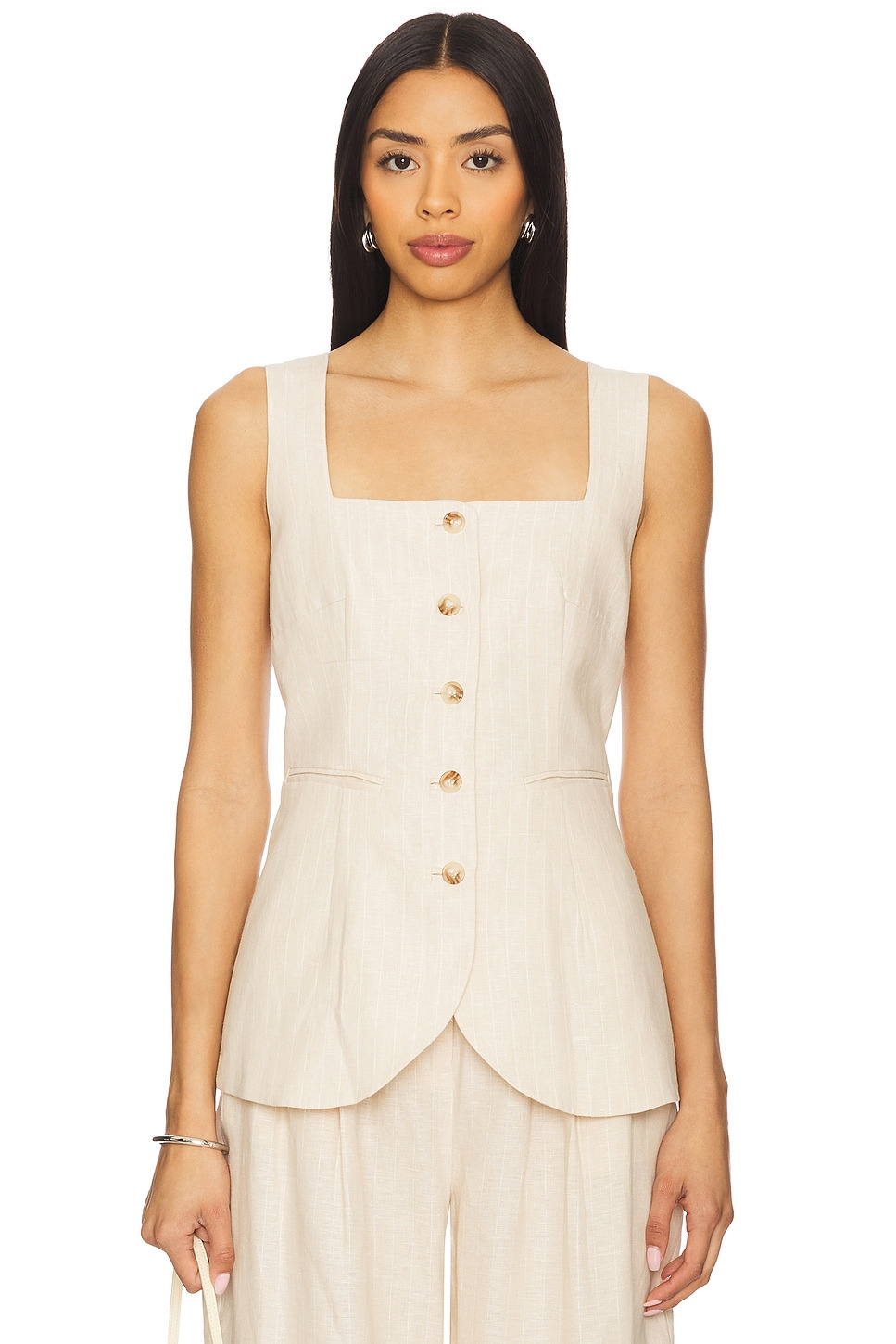 - Self: 100% linen Lining: 100% cotton - Dry clean only - Front button closure - Side welt pockets - Adjustable buckle at back - Square neckline - Midweight linen fabric - Item not sold as a set - Revolve Style No. PSSE-WS28 - Manufacturer Style No. PS1372-BGE