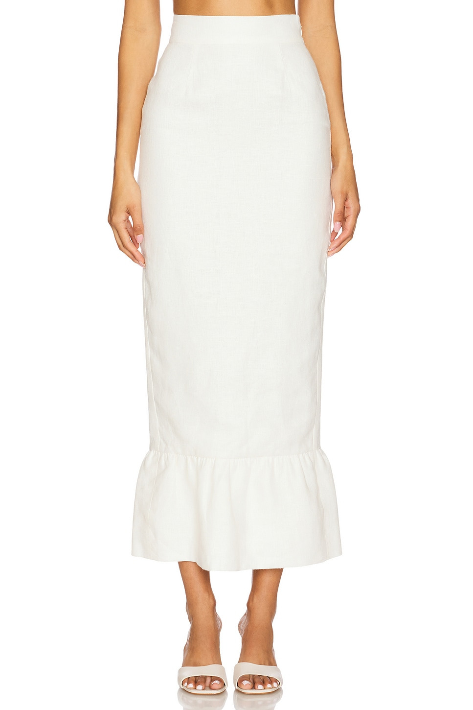 - Linen textile - Hand wash recommended - Fully lined - Hidden side zip closure - Ruffle trim - Midweight linen fabric - Skirt measures approx 39" in length - Revolve Style No. PSSE-WQ19 - Manufacturer Style No. PS1337-CRM