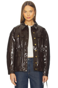 - Self 1: 100% polyester Self 2: 100% polyurethane Lining: 60% polyester 40% cotton - Dry clean only - Front button closure.4-front flap pocket design - Elasticized waist - Buttoned cuffs - Faux patent leather fabric - Revolve Style No. RGBR-WO149 - Manufacturer Style No. RA6425FSMFL