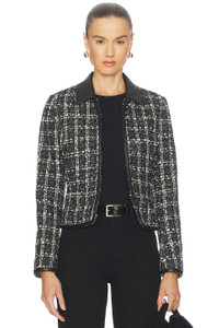 - Self: 100% Polyester Lining: 51% Viscose, 49% Polyester Lining 2: 51% Viscose, 49% Polyester Self 2: 100% Polyurethane Self 3: 100% Polyester - Dry clean only - Front hook and eye closures - Fully lined - Front faux pockets - Faux leather collar and trim - Midweight tweed fabric - Revolve Style No. RGBR-WO150 - Manufacturer Style No. RA6N25F4MTA