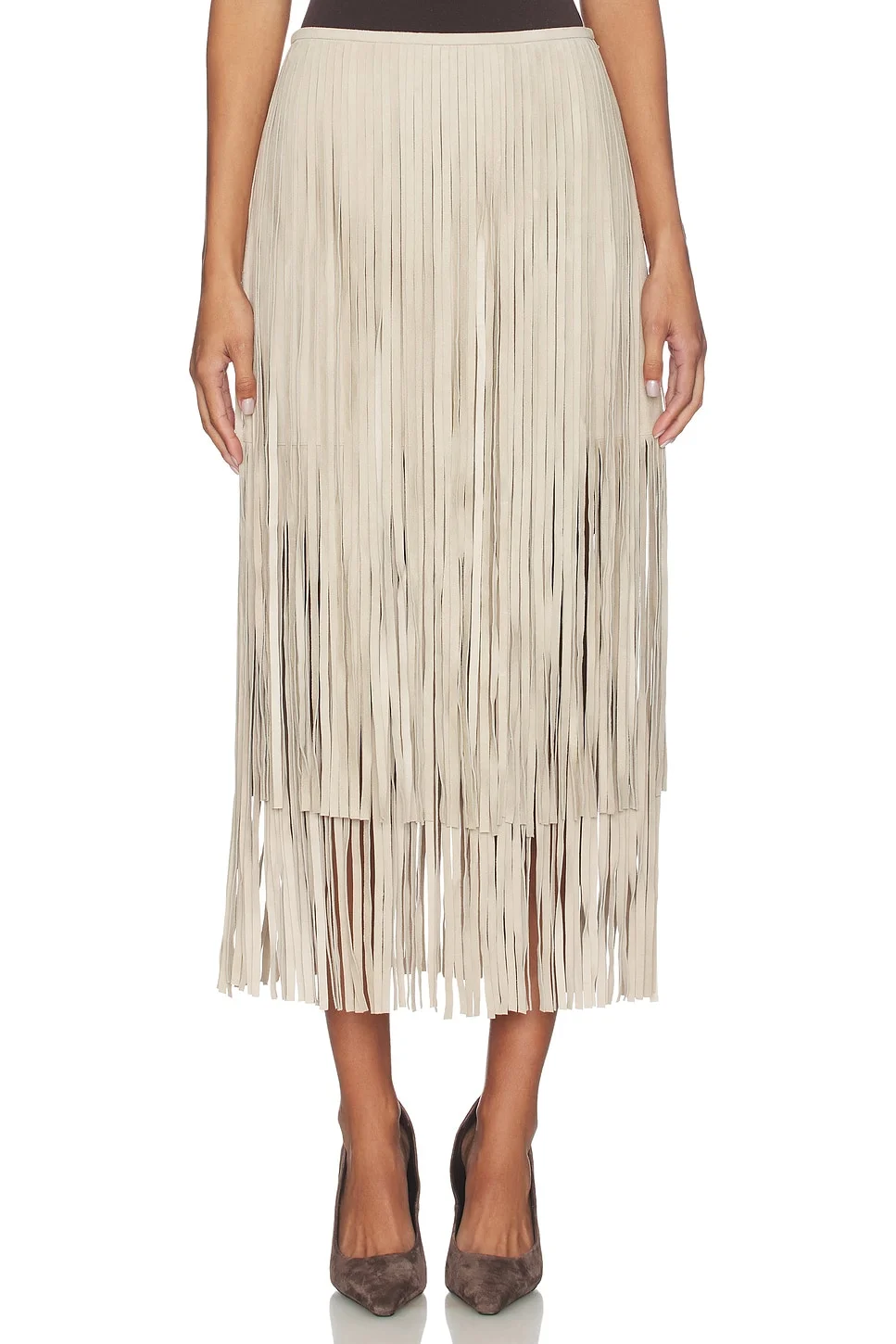 - 100% goat suede - Made in India - Dry clean only - Fully lined - Side zipper closure - Layered western fringe - Skirt measures at approx 34" in length - Revolve Style No. RGBR-WQ43 - Manufacturer Style No. RA7R25HBMEM