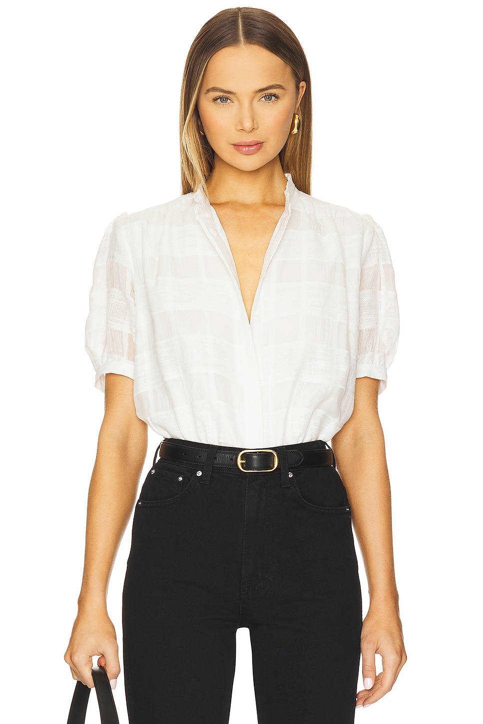 - Self: 90% cotton 10% cupro Lining: 100% cotton - Machine wash cold - Hidden front button closures - Pleated collar - Semi-sheer sleeves with subtle puff design and button cuffs - Midweight linen fabric with tonal plaid stitching - Revolve Style No. RGBR-WS574 - Manufacturer Style No. WAW25SA0462746