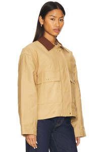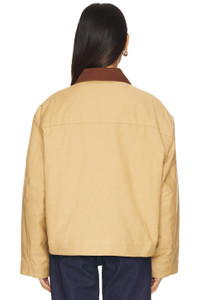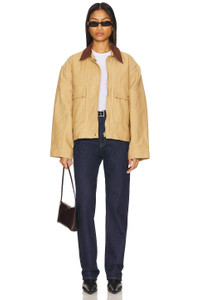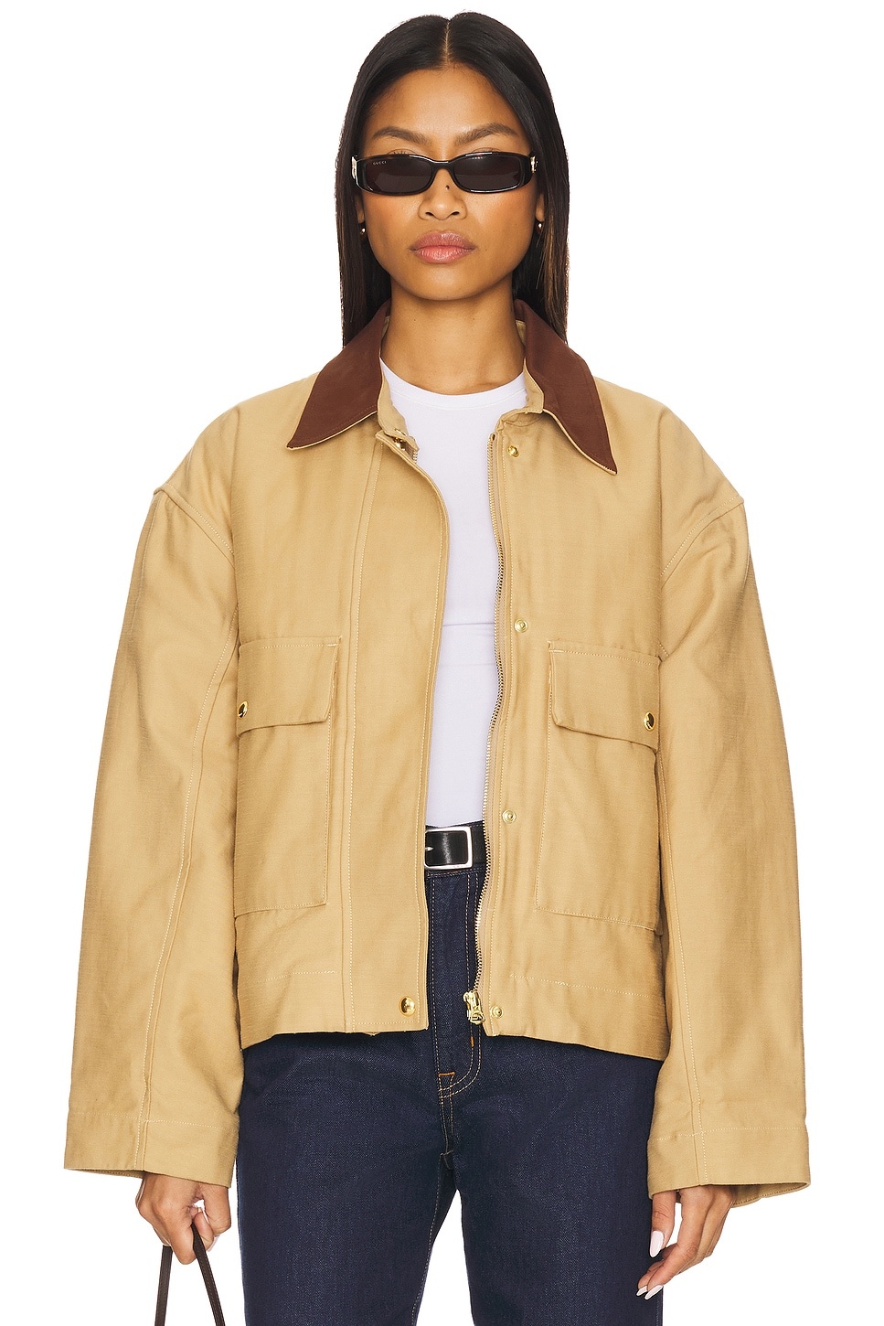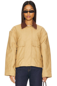 - Self: 100% cotton Lining: 51% viscose 49% polyester Filling: 100% polyester - Made in Indonesia - Machine was - Hidden front zipper and button snap closures - Front flap pockets and side slit pockets - Removable lining - Twill fabric - Revolve Style No. RGBR-WO142 - Manufacturer Style No. WAW25S20167516