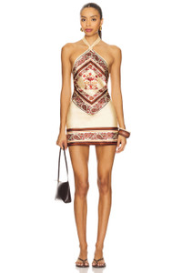 - Self: 95% silk 5% spandex Lining: 97% polyester 3% spandex - Dry clean only - Unlined - Halterneck and back tie closure - Back cut-out detail - Lightweight charmeuse fabric - Revolve Style No. ROFR-WD998 - Manufacturer Style No. SS24-8739