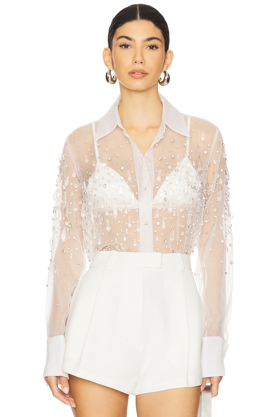 - 100% nylon - Dry clean only - Front button closure - Buttoned cuffs - Lightweight chiffon fabric with rhinestone embellishments - Garment is intentionally sheer, undergarments will show through - Please note undergarment not included - Revolve Style No. ROFR-WS340 - Manufacturer Style No. HL25-10433