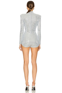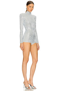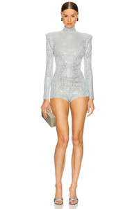 - 59% nylon 21% polyester 13% acrylic 7% wool - Made in China - Dry clean only - Exposed back zipper closure - Mockneck styling - Padded shoulders - Crystal embellished knit fabric - Revolve Style No. ROFR-WR17 - Manufacturer Style No. HL25-10466