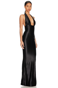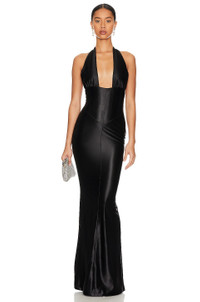 - 95% polyester 5% spandex - Made in China - Dry clean only - Fully lined - Hidden back zipper closure - Halterneck styling with dual loop button closure Plunging neckline - Sheen satin finish with back vent - Revolve Style No. ROFR-WD464 - Manufacturer Style No. HL23-6039
