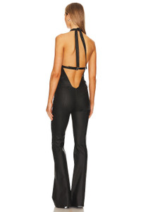 - 80% rayon 15% nylon 5% spandex - Made in China - Hand wash - Halterneck tie closure - Back loop through buckle closure - Zip fly with button closure - Side slip pockets - The Cynthia Jumpsuit from Retrofete in coated denim is a retro-inspired silhouette with just a hint of stretch. - Revolve Style No. ROFR-WC39 - Manufacturer Style No. FW22-5558R