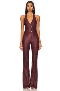 - 76% viscose 21% polyamide 3% elastane - Made in China - Machine wash - Zip fly with button closure - Halterneck styling with tie detail - Front slip pockets - Back cut-out with adjustable strap Midweight coated denim fabric - Revolve Style No. ROFR-WC58 - Manufacturer Style No. FW22-5558-T