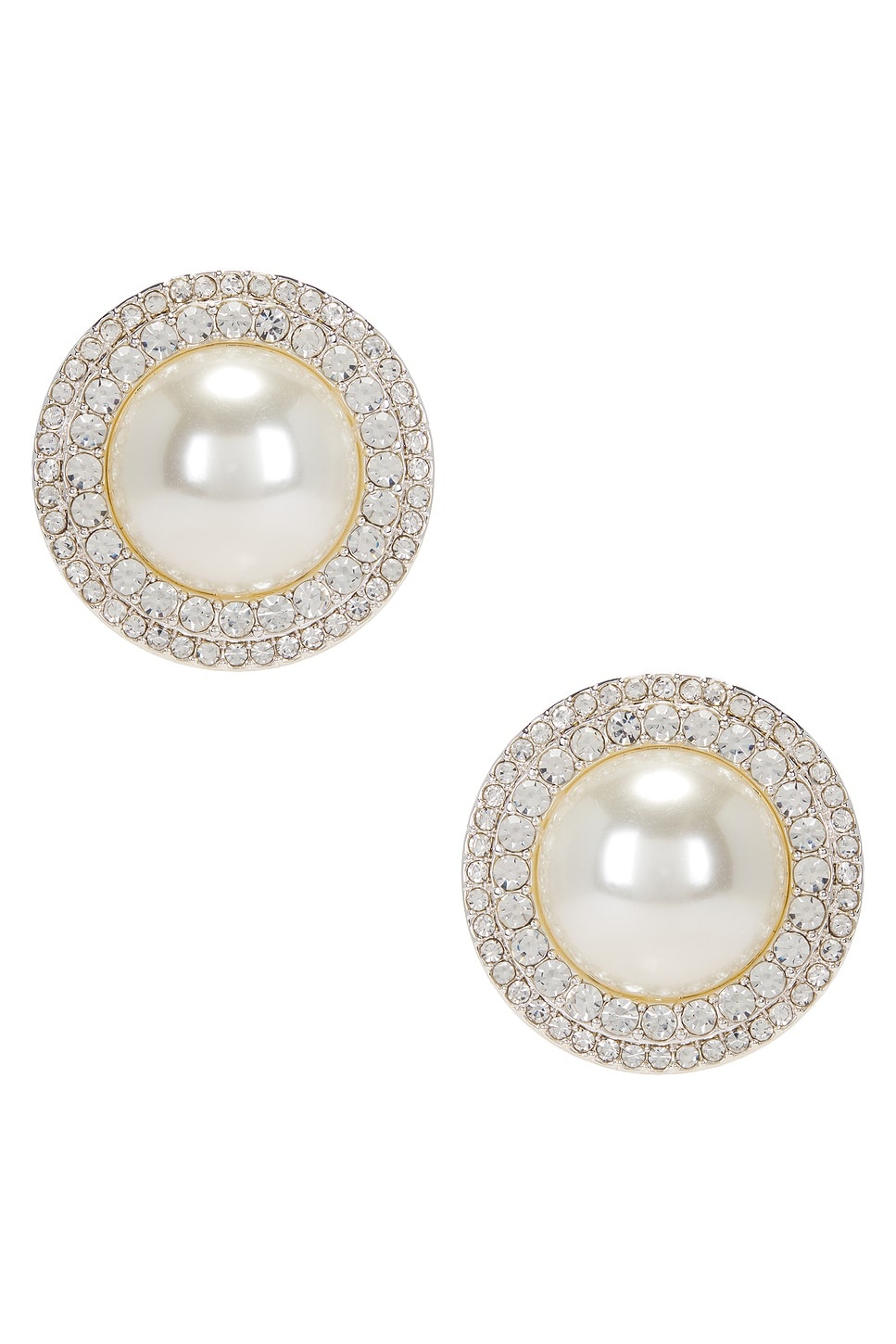- Crystal embellished earrings with faux pearl at center - Made in China - Post-back and clasp closure - Measures approx 1.5" W x 1.5" H - Revolve Style No. ROFR-WL45 - Manufacturer Style No. HL25-10783-ACC