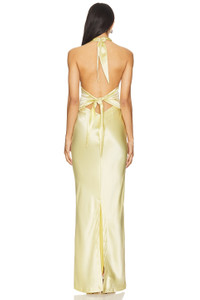 - Self: 76% acetate 24% polyester Lining: 97% polyester 3% spandex - Dry clean only - Partially lined at bust - Hidden back zip closure - Halterneck styling with tie closure and back tie closure - Front knot accent - heavyweight satin fabric - Revolve Style No. ROFR-WD949 - Manufacturer Style No. PF23-7229