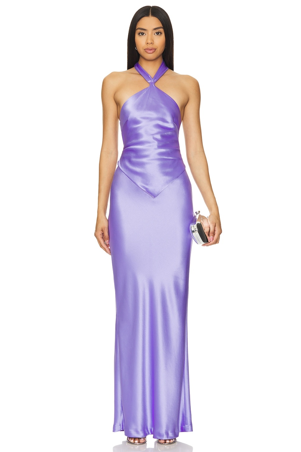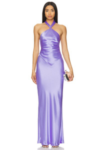 - Self:76% acetate 24% polyester Lining: 97% polyester 3% spandex - Made in China - Dry clean only - Partially lined - Hidden back zipper closure with halterneck tie - Revolve Style No. ROFR-WD717 - Manufacturer Style No. PF23-7229