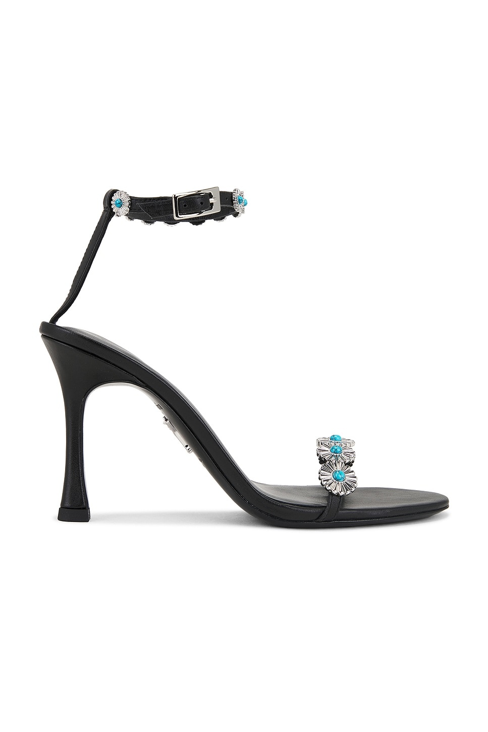- Leather upper with leather sole - Silver-tone ankle buckle closure - Cushioned leather footbed and lining - Silver-tone metal with turquoise-tone stone accents on straps - Almond toe - Sculptural heel - Approx 90mm/ 3.5 inch heel - Revolve Style No. ROFR-WZ40 - Manufacturer Style No. R-SS25-11084-SH