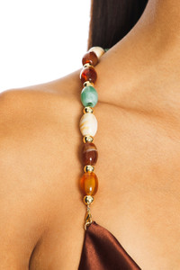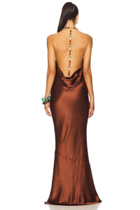 - Self: 73% acetate 27% polyester Lining: 97% polyester 3% spandex - Dry clean only - Partially lined - Beaded halterneck styling with lobster clasp closure - Satin fabric with draped back - Revolve Style No. ROFR-WD987 - Manufacturer Style No. R-SS25-11446-17