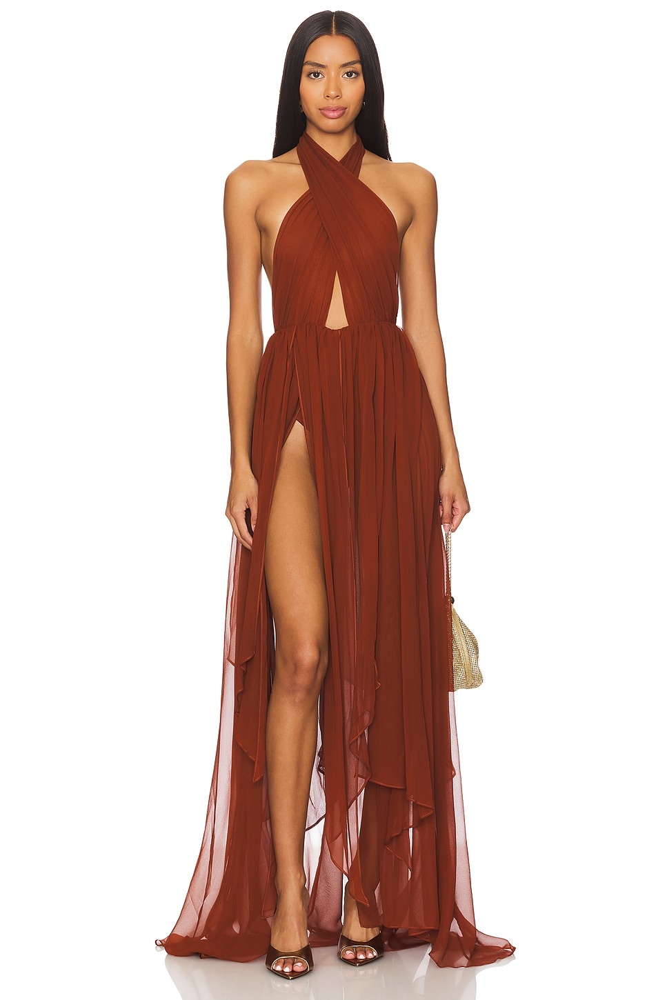 - Self: 100% silk Lining: 87% nylon 13% spandex - Made in China - Dry clean only - Partially lined - Partial hidden back zip closure and snap gusset - Halterneck tie - Chiffon fabric with side slit - Revolve Style No. ROFR-WD836 - Manufacturer Style No. SS23-6520