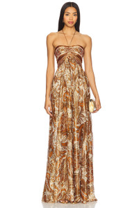 - Self: 78% silk 22% metallic threading Lining: 100% polyester - Hand wash - Unlined - Hidden back zipper with hook and eye closure Back strap with button closure - Halterneck styling - Lightweight chiffon fabric with metallic threading - Revolve Style No. ROFR-WD982 - Manufacturer Style No. R-SS25-11347-17