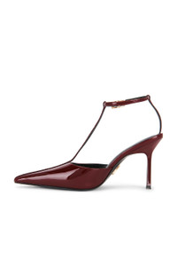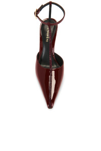 - Patent leather and silk satin upper with leather sole - Ankle strap with buckle closure - Leather insole and lining - Pointed toe - Gem-like embellishment at t-strap - Approx 100mm/ 4 inch heel - Revolve Style No. ROFR-WZ60 - Manufacturer Style No. R-FW25-11745-00
