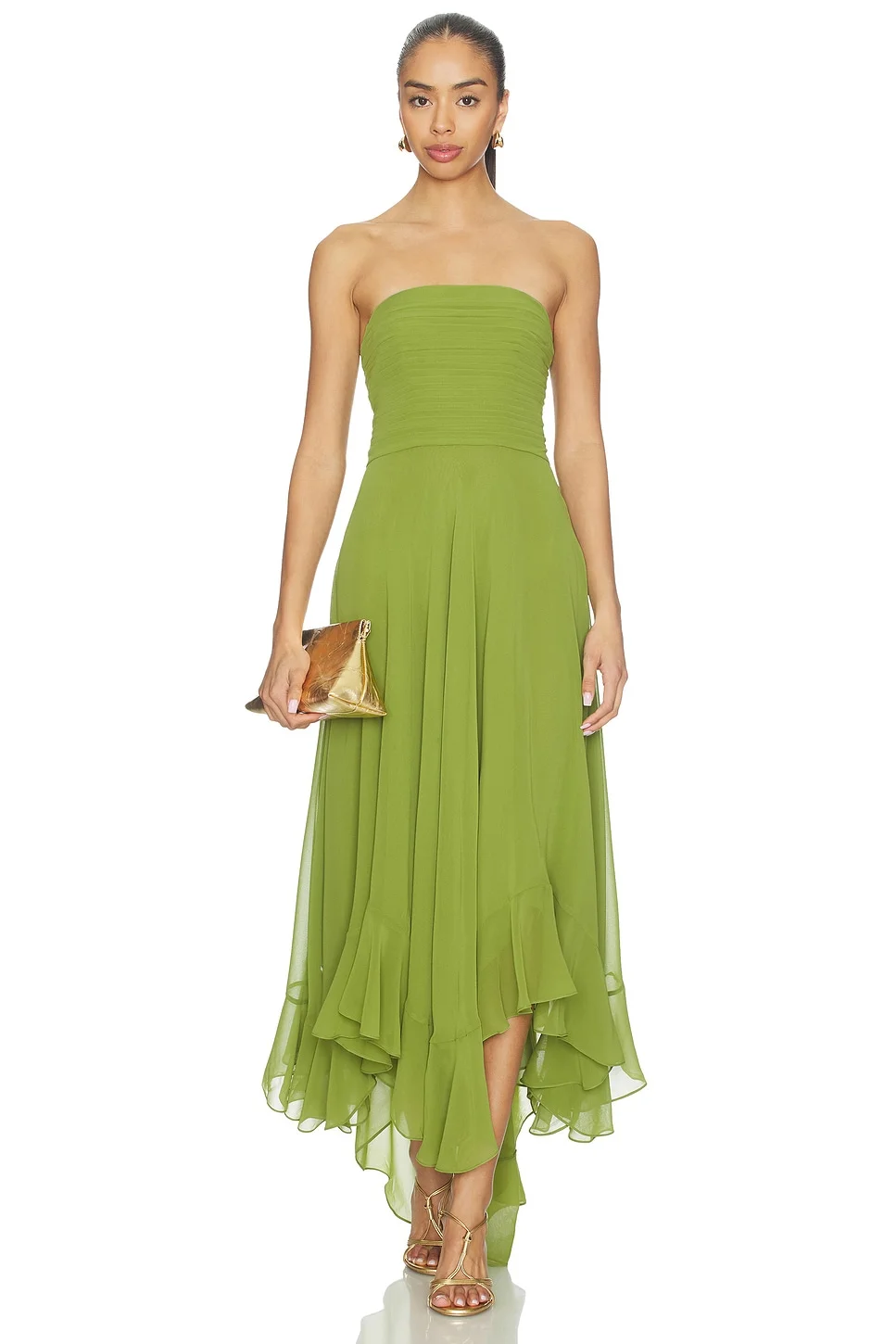 - Self & Lining: 100% polyester - Made in China - Dry clean only - Fully lined - Hidden side zip closure - Midweight crepe fabric - Asymmetrical hem - Neckline to shortest hem measures approx 41" and to longest hem approx 53" in length - Revolve Style No. ROFR-WD1200 - Manufacturer Style No. R-PF25-11714-17