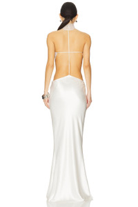 - Self 1:100% nylon Self 2: 76% acetate 24% polyester Lining 1: 95% viscose 5% spandex Lining 2: 97% polyester 3% spandex - Made in China - Dry clean only - Fully lined - Concealed side zipper with hook and eye closure Attached lace turtleneck button loop closure - Attached eyelash lace mockneck with button loop closure and adjustable back t-straps - Midweight satin fabric with lace trim and cut-out design - Neckline to hem measures approx 60" in length - Revolve Style No. ROFR-WD934 - Manufacturer Style No. HL24-8000