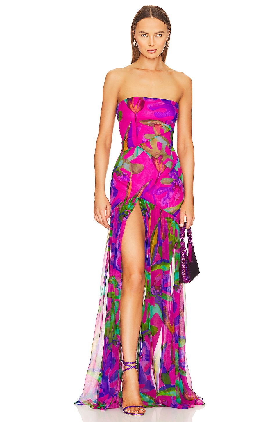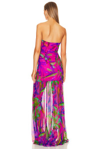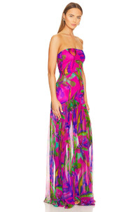 - Self: 100% silk Lining: 97% polyester 3% spandex - Made in China - Dry clean only - Partially lined - Hidden side zipper closure - Lightweight silk fabric with side seam slit - Neckline to hem measures approx 57" in length - Revolve Style No. ROFR-WD490 - Manufacturer Style No. FW22-5555