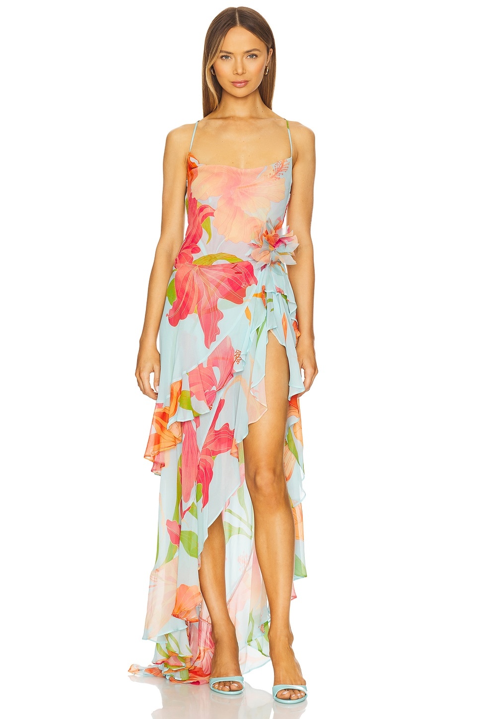 - Self: 100% viscose Contrast Fabric: 100% silk - Dry clean only - Partially lined - Hidden side zip closure - Ruffled design throughout - Asymmetric hem - Floral design on crepe fabric - Revolve Style No. ROFR-WD956 - Manufacturer Style No. SS24-8855