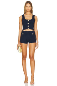- 60% rayon 32% nylon 5% metallic 3% spandex - Made in China - Dry clean only - Elastic waistband - Faux front pocket detail - Item not sold as set - Jersey fabric with metallic threading - Shorts measure approx 10.5" in length - Revolve Style No. ROFR-WF49 - Manufacturer Style No. SS24-9134