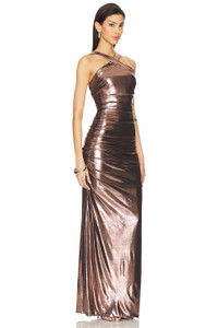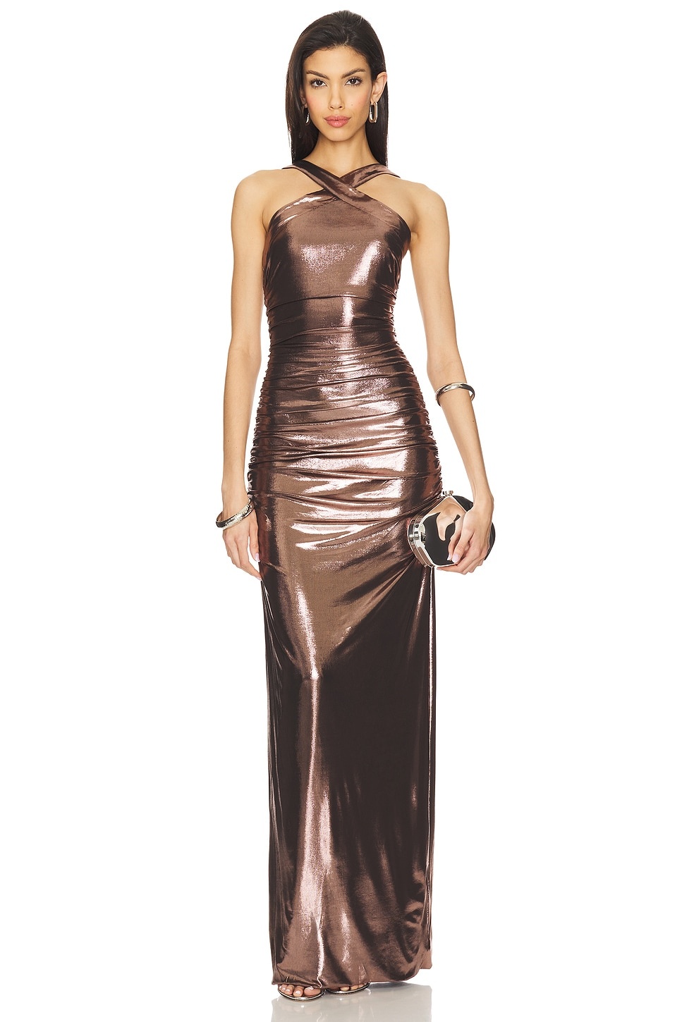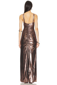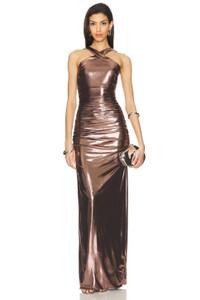- Self: 92% polyester 8% spandex Lining: 95% polyester 5% spandex - Hand wash - Fully lined - Hidden back zip closure - Ruched back - Heavyweight lame fabric - Revolve Style No. ROFR-WD945 - Manufacturer Style No. R-SS25-11208-17