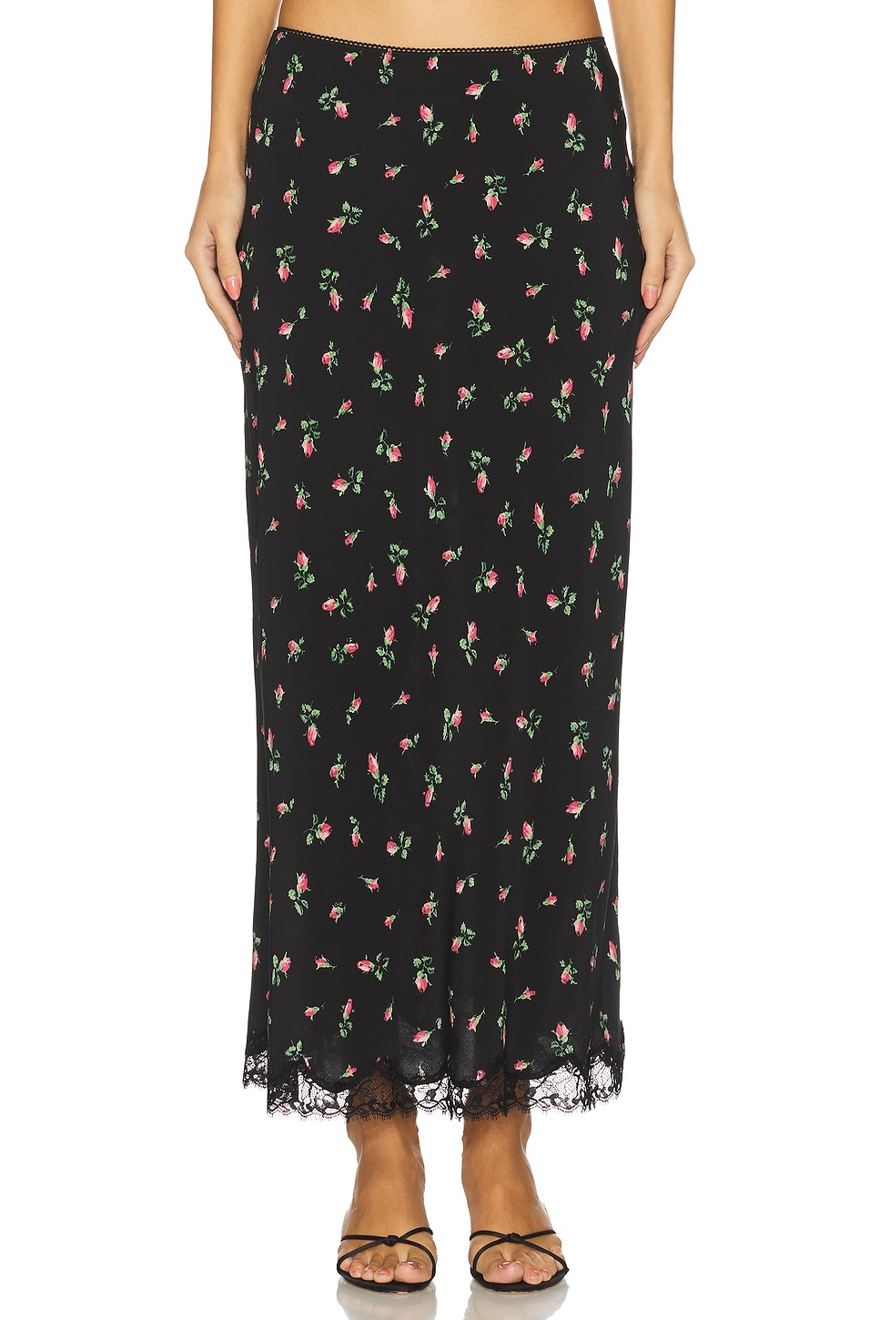 - Self 1: 100% silk Self 2: 100% polyester - Made in China - Dry clean - Unlined - Pull on styling Elastic waistband - Satin textile - Lace trim hem - Skirt measures approx 35" in length - Revolve Style No. RIXR-WQ12 - Manufacturer Style No. 020.05402.425.06937