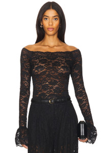 - Self & Combo: 90% nylon 10% spandex - Made in China - Dry clean only - Pull-on styling - Off the shoulder styling - Lightweight lace fabric with ruffle cuffs - Garment is intentionally sheer, undergarments will show through - Please note undergarment not included Item not sold as a set - Revolve Style No. RONR-WS443 - Manufacturer Style No. 393981LAC