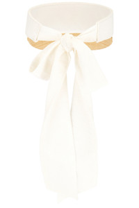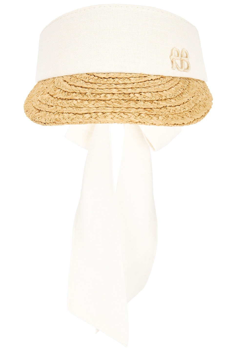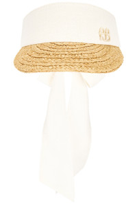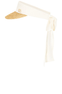 - Self 1: 55% linen 45% viscose Self 2: 100% straw Lining: 100% cotton - Adjustable back tie closure - Linen fabric with raffia visor - Brim measures approx 3" in length OS measures approx 21.98" in circumference - Revolve Style No. RUSR-WA166 - Manufacturer Style No. KZR035/036-LNV-STR-LNT-BOW-SRB
