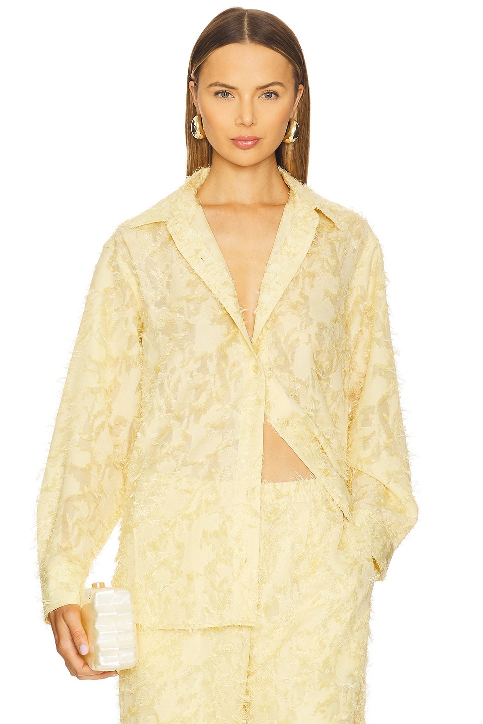 - 50% recycled polyester 50% polyester - Made in China - Machine wash - Front button closure - Buttoned cuffs - Midweight crepe fabric with frill detailing allover - Garment is made with a semi-sheer fabric, undergarments can show through - Item not sold as a set - Revolve Style No. SSAM-WS9 - Manufacturer Style No. F25100090