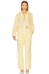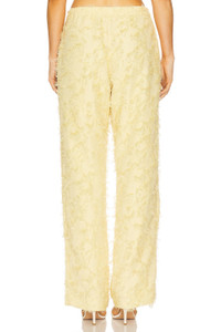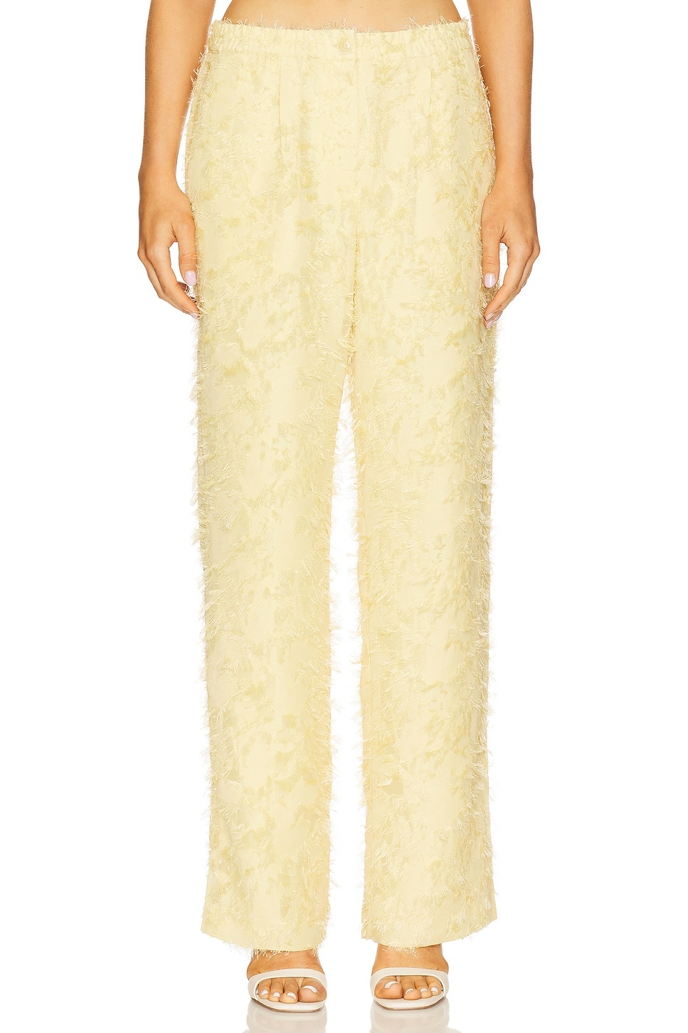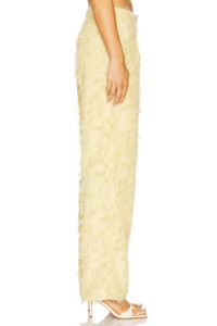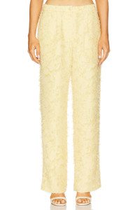 - Self: 50% recycled polyester 50% polyester Lining: 100% polyester - Made in China - Machine wash - Front zipper with button closure Elastic waistband - Side pockets - Midweight crepe fabric with frill detailing allover - Item not sold as a set.20.5" at the knee narrows to 19" at the leg opening - Revolve Style No. SSAM-WP4 - Manufacturer Style No. F25100187