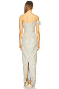 - Jacquard fabric - Imported - Dry clean recommended - Fully lined - Hidden back zip closure - Floral fabric with metallic accents throughout - Midweight jacquard fabric with boned bodice and pleated styling - Neckline to hem measures approx 57" in length - Revolve Style No. SLEE-WD404 - Manufacturer Style No. R24D42