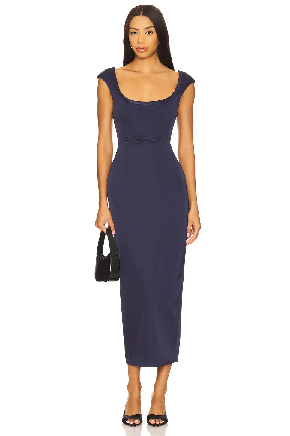 - Satin textile - Imported - Dry clean recommended - Fully lined - Hidden back zipper closure - Front and back scoop neckline - Satin fabric with back vent - Revolve Style No. SLEE-WD456 - Manufacturer Style No. F25D21