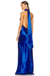 - 75% acetate 25% polyester - Imported - Dry clean recommended - Unlined - Mockneck styling with loop button closure - Open back design - Midweight satin fabric with side seam slit - Revolve Style No. SLEE-WD178 - Manufacturer Style No. S22D05