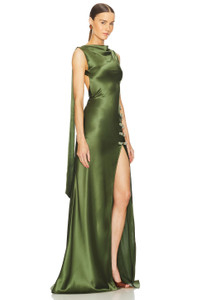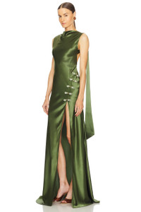 - Shell: 75% acetate 25% polyester Lining: 97% polyester 3% spandex - Made in China - Hand wash cold - Partially lined - Hidden back zipper closure - Satin fabric with seam slit and draping accents - Revolve Style No. SLEE-WD335 - Manufacturer Style No. F24D14
