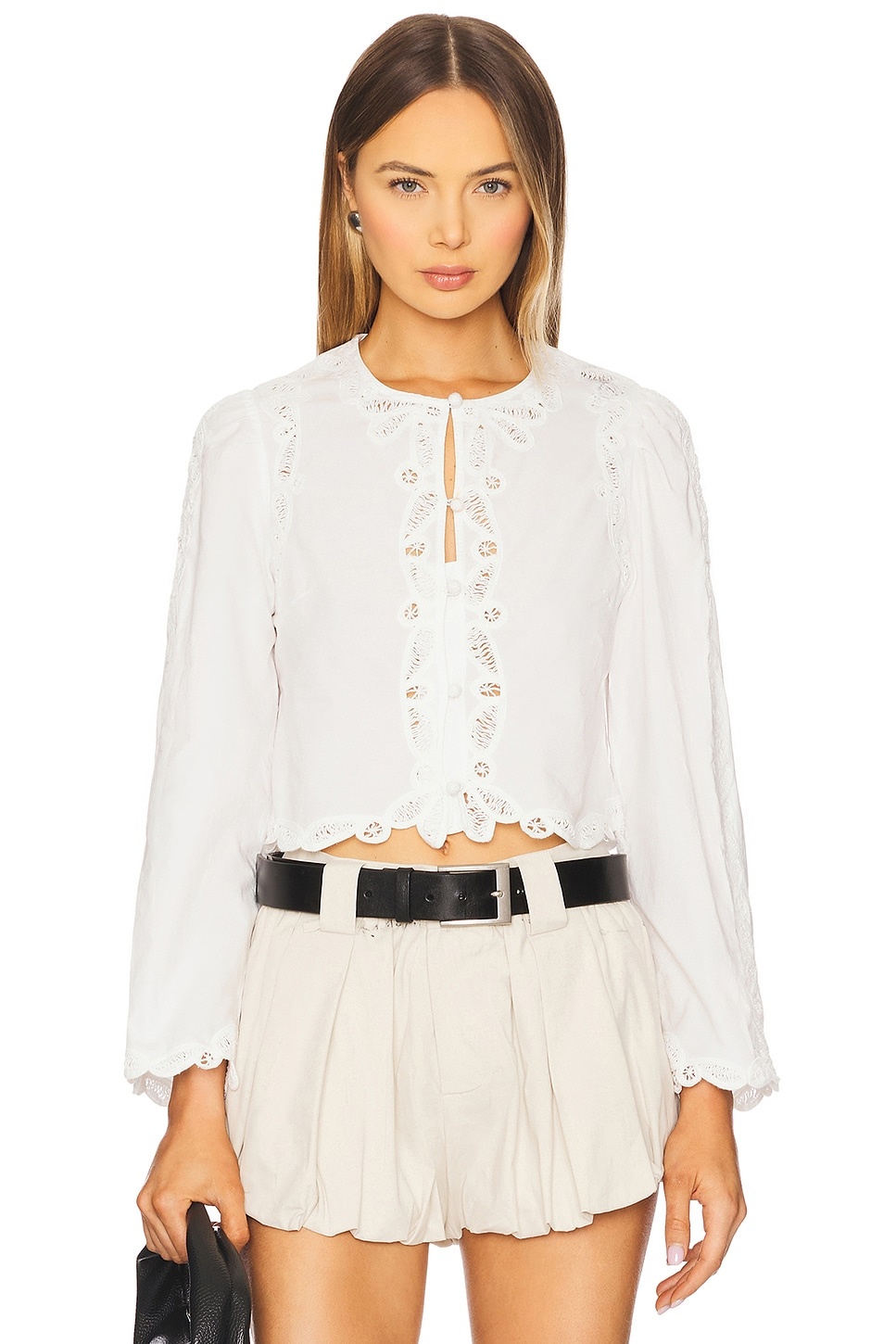 - Self & Contrast Fabric: 100% cotton - Dry clean only - Front button loop closure - Floral lace detailing - Cropped styling - Lightweight poplin fabric - Garment is made with a semi-sheer fabric, undergarments can show through - Revolve Style No. SEA-WS11 - Manufacturer Style No. SS25-088