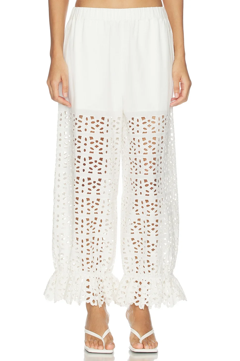 - Self 1: 85% cotton 15% linen Lining: 100% cotton Embroidery: 100% polyester - Made in India - Dry clean - Partially lined - Elasticized waistband - Midweight woven twill textile with contrast eyelet legs - Side seam pockets with flounced cuffs Item not sold as set - Leg opening measures approx 26" - Revolve Style No. SEA-WP11 - Manufacturer Style No. SS26-084