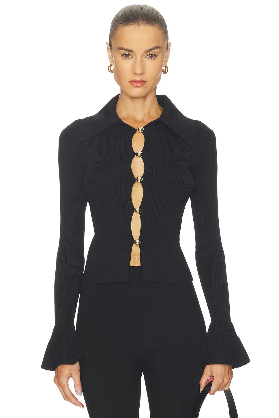 - 50% viscose 32% polyester 16% polyamide 2% elastane Trim: 68% viscose 21% polyester 10% polyamide 1% elastane - Made in China - Dry clean - Front gold-tone button closure - Flared cuffs - Ribbed ponte fabric - Revolve Style No. SELF-WS57 - Manufacturer Style No. RS26-138TA-B