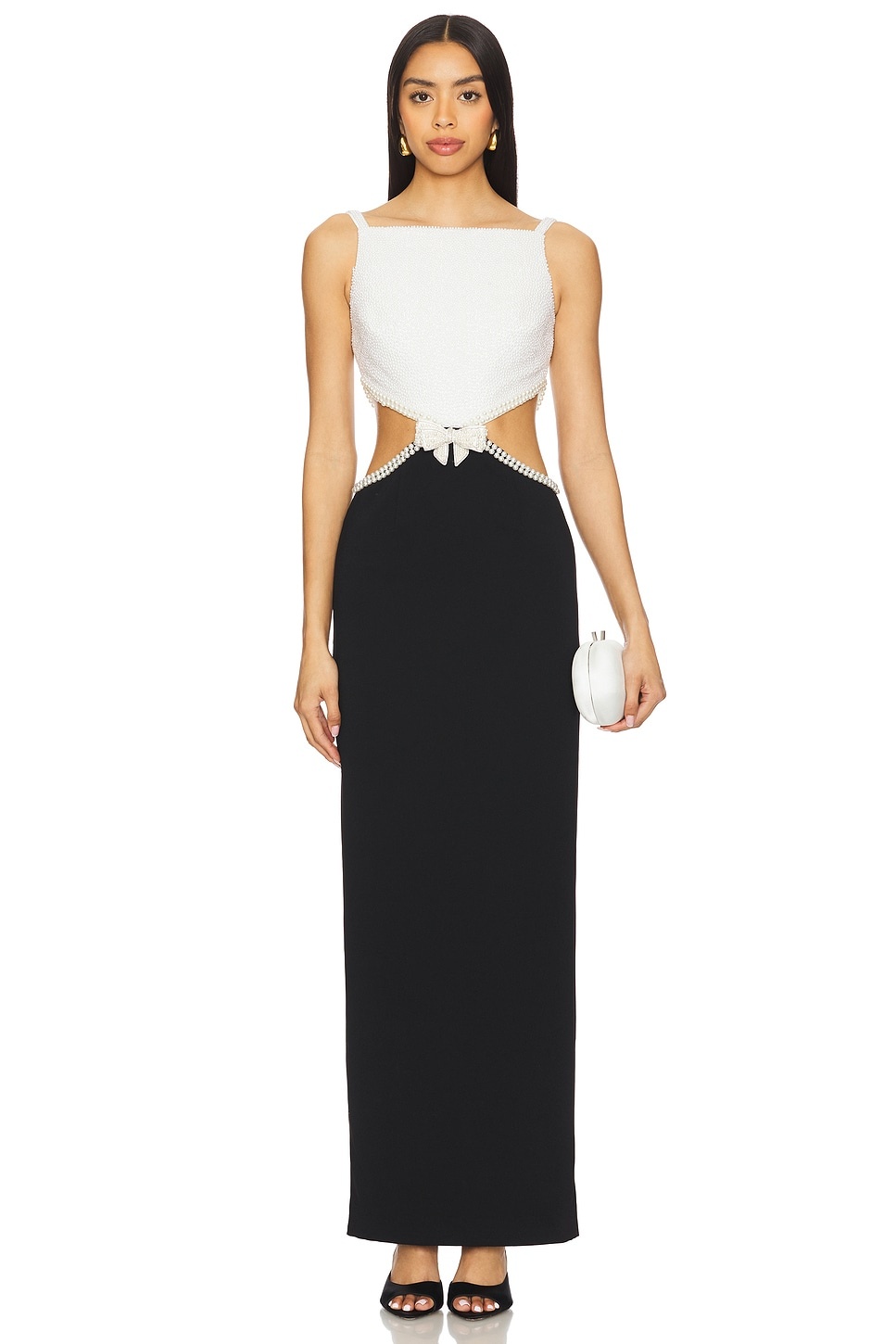 - Self & Lining: 100% polyester - Made in China - Dry clean only - Fully lined - Hidden back zip closure - Front embellished faux pearl bow accent and side cut-outs - Heavyweight crepe skirt with faux pearl bustier - Revolve Style No. SELF-WD249 - Manufacturer Style No. SS25-081X-BW